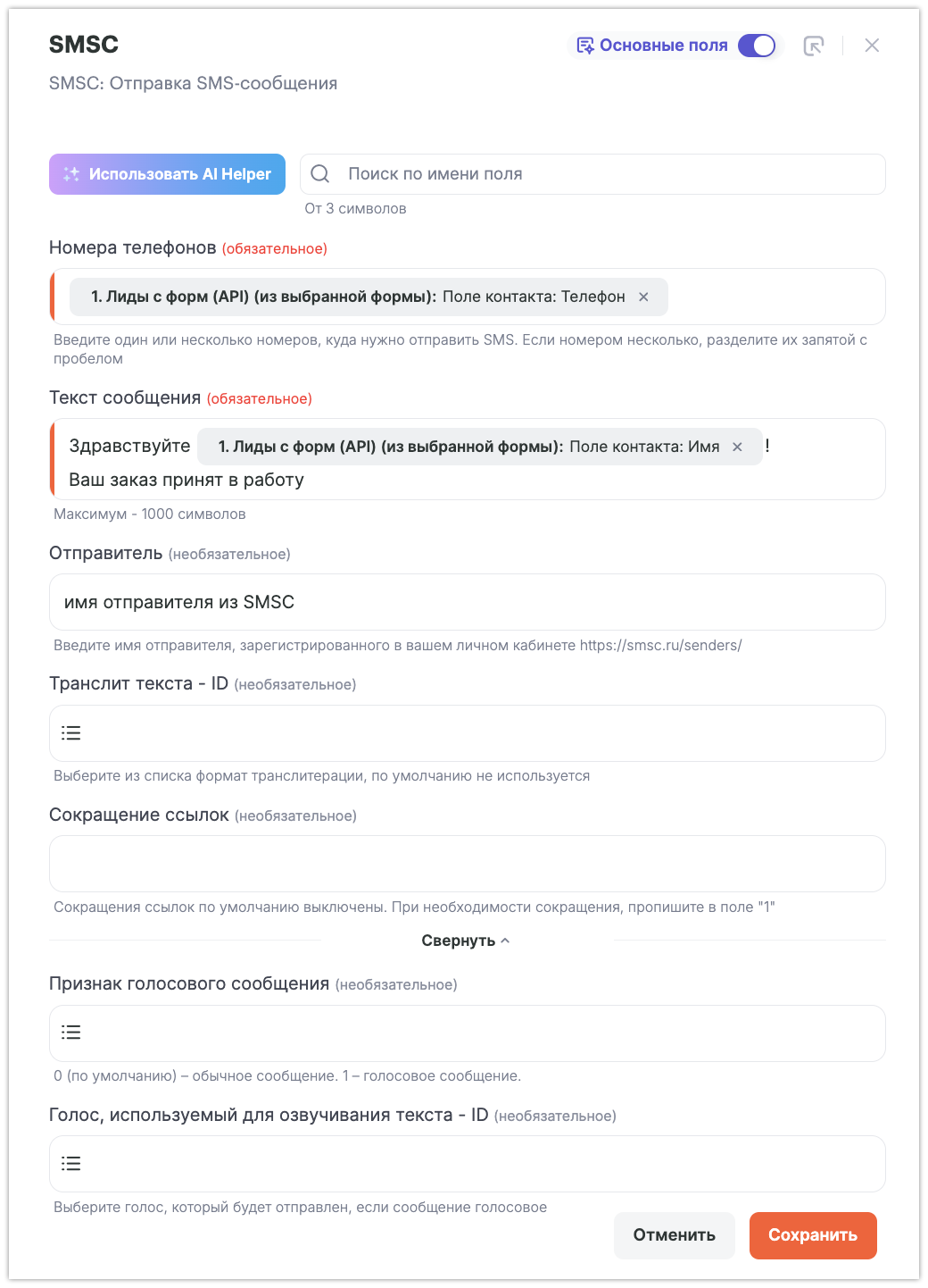 В окне настроек необходимо сопоставить поля VK реклама и SMSC
