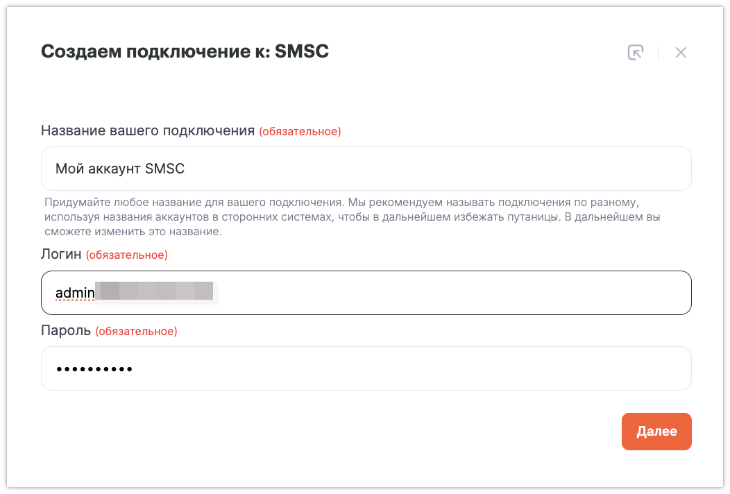Нажмите «Добавить подключение», введите свои данные для входа в аккаунт SMSC: