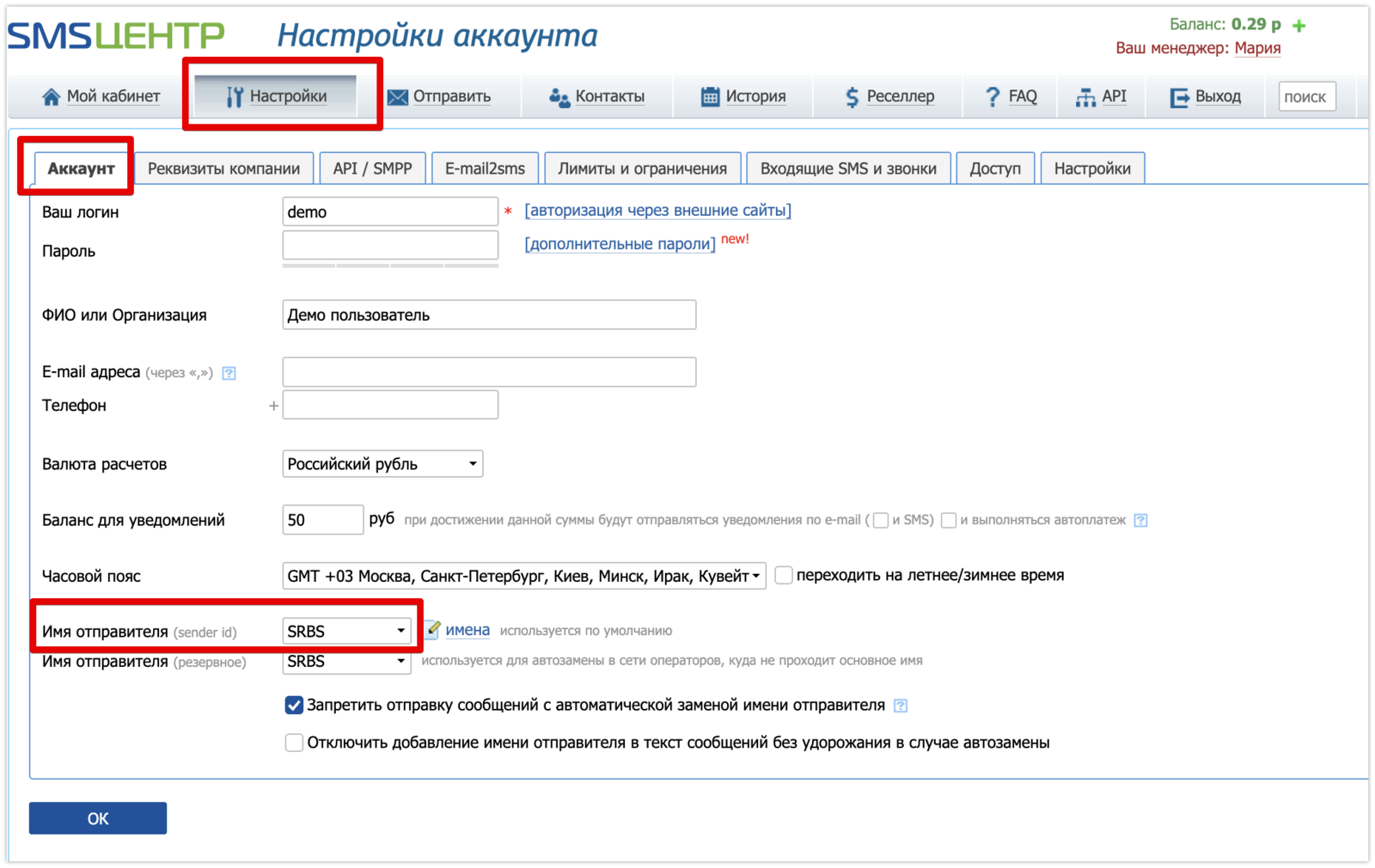 Имя отправителя нужно указать из вашего аккаунта SMSC. Скопируйте значение из раздела Настройки — Аккаунт: