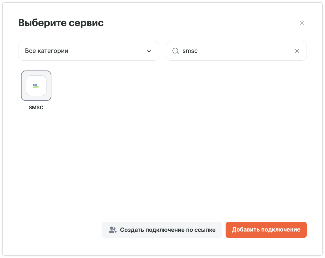 Зайдите в раздел «Подключения», нажмите на кнопку «Добавить подключение» и выберите из списка «SMSC».