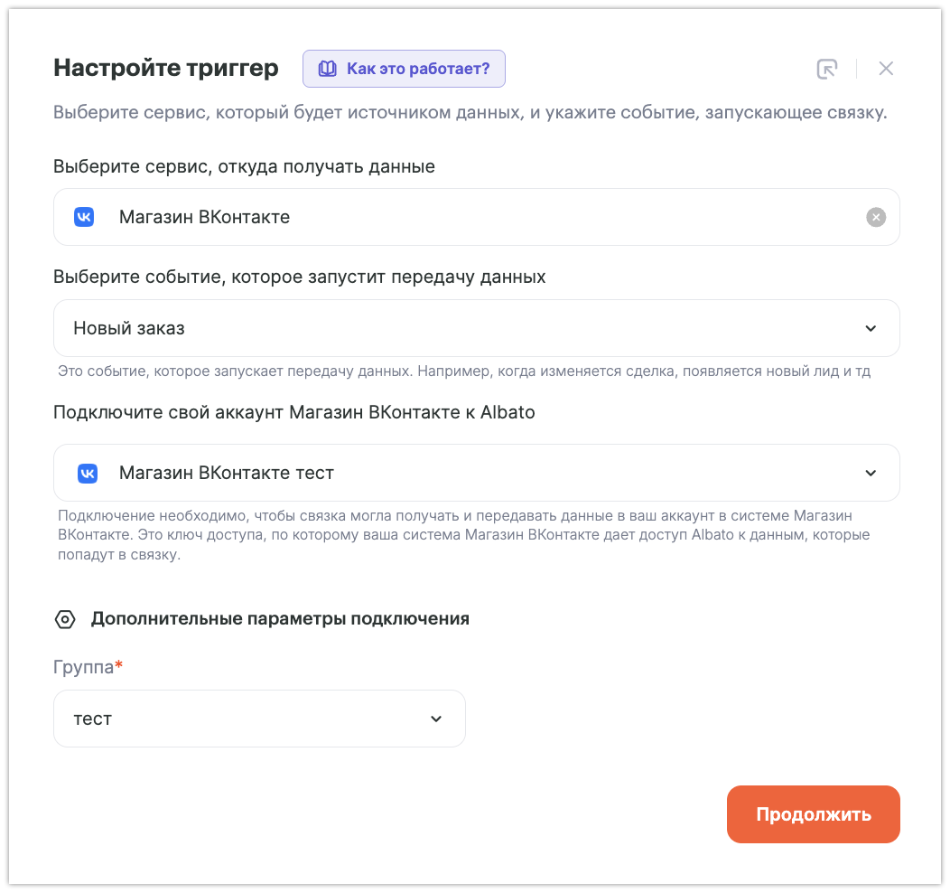 - Сервис, из которого будет запускаться сценарий — «Магазин ВКонтакте».