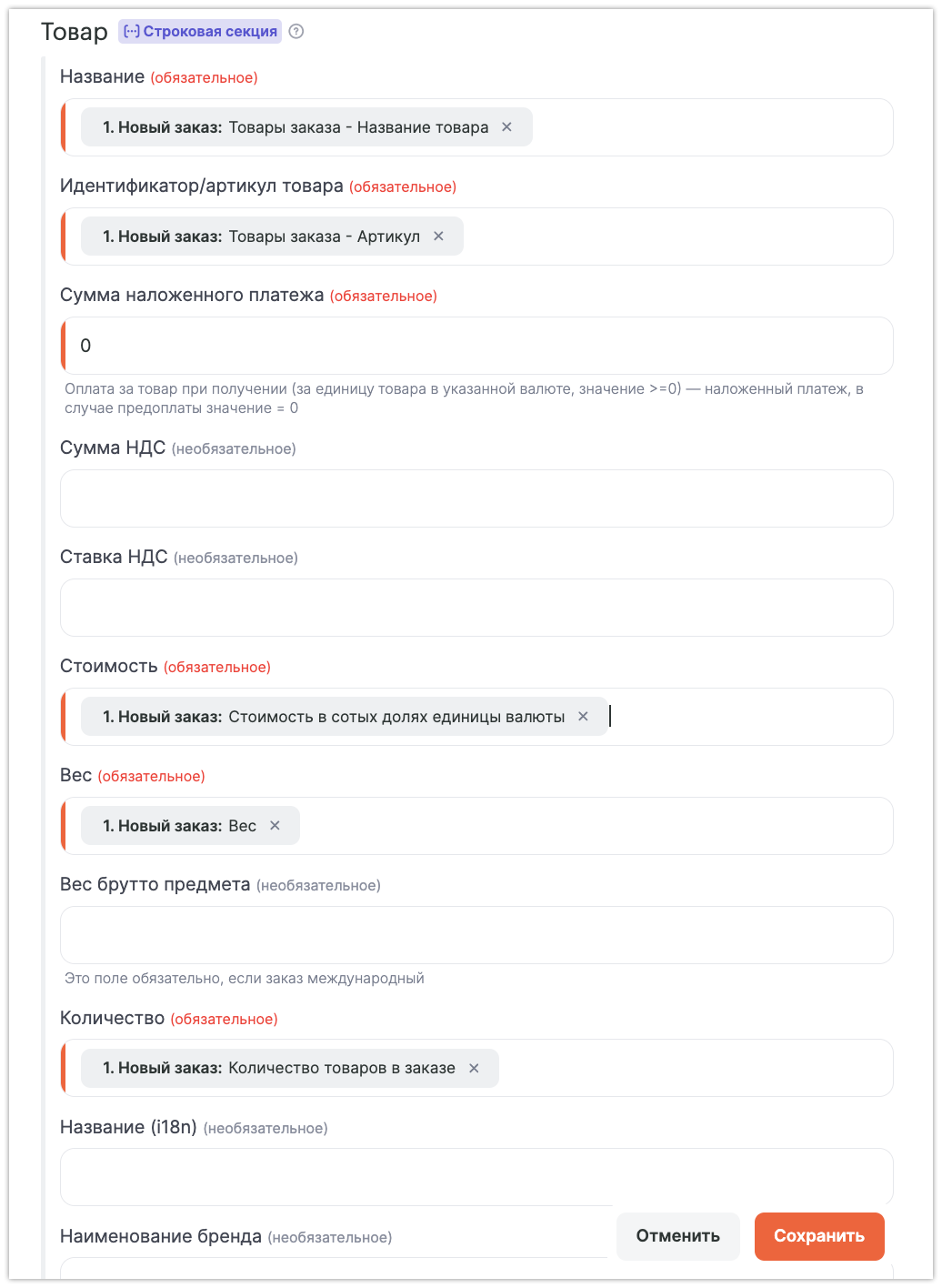Сумма наложенного платежа — в нашем примере статично вписана «0» (поэтому не заполняем ниже два поля про НДС).