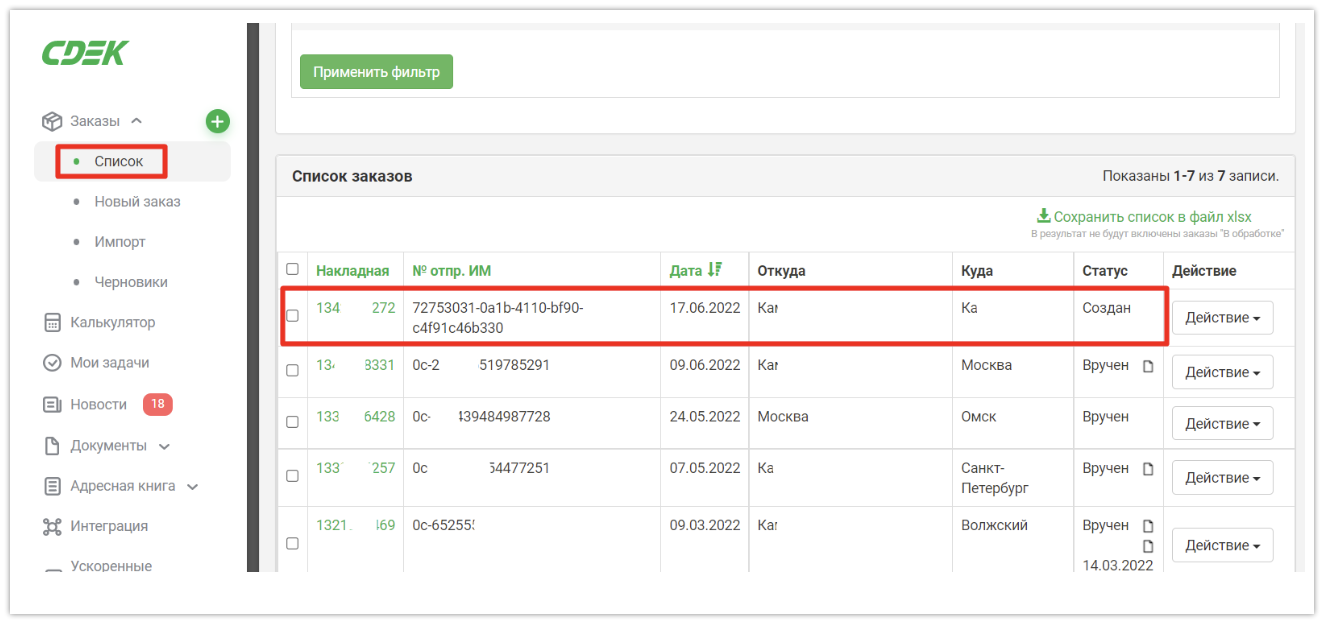 В СДЭКе создался заказ, если ошибок нет, его можно найти в разделе «Заказы» → «Список».
