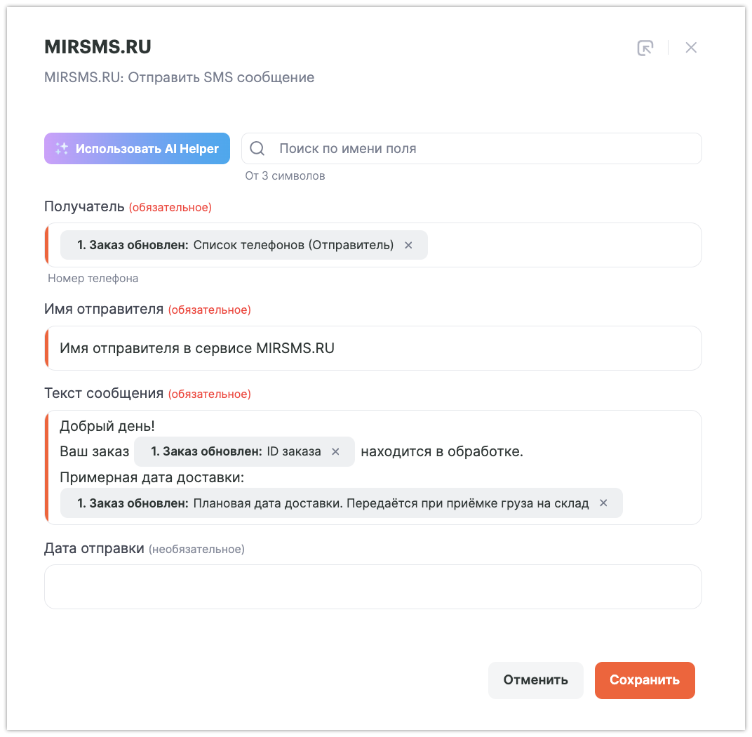 ФИО получателя и Получатель – список телефонов — параметры из ВКонтакте.