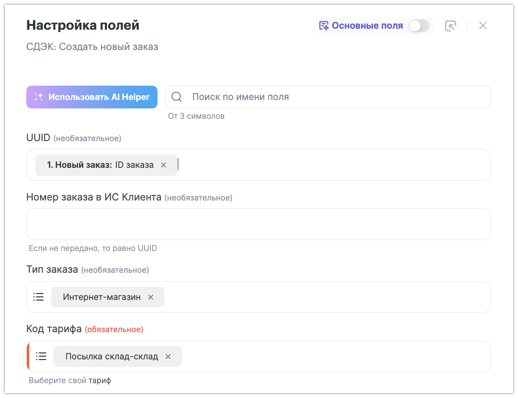 Тип заказа и Код тарифа — параметры из справочника.