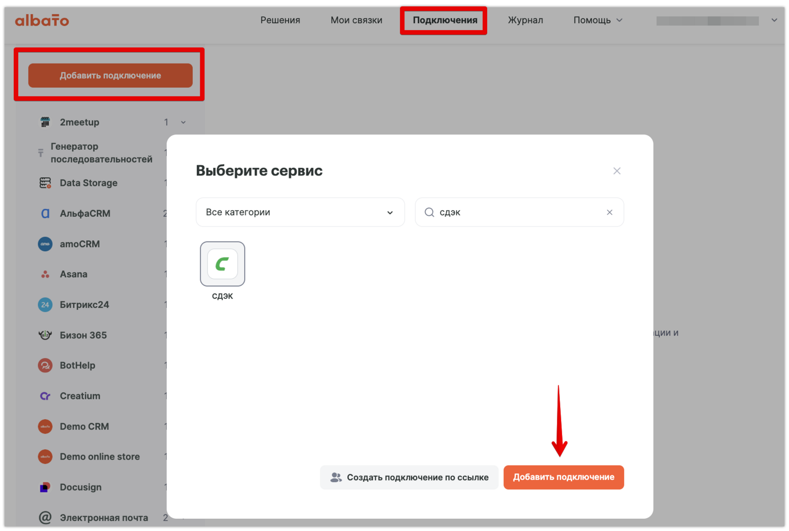 Зайдите в раздел «Подключения», нажмите «Добавить подключение» и выберите из списка СДЭК.