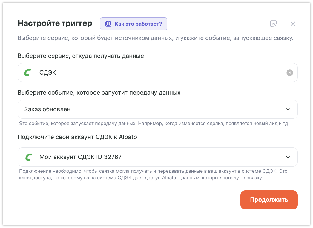 Если вы хотите передавать данные между каким-то сервисом и СДЭК, настройте интеграцию с помощью Albato.