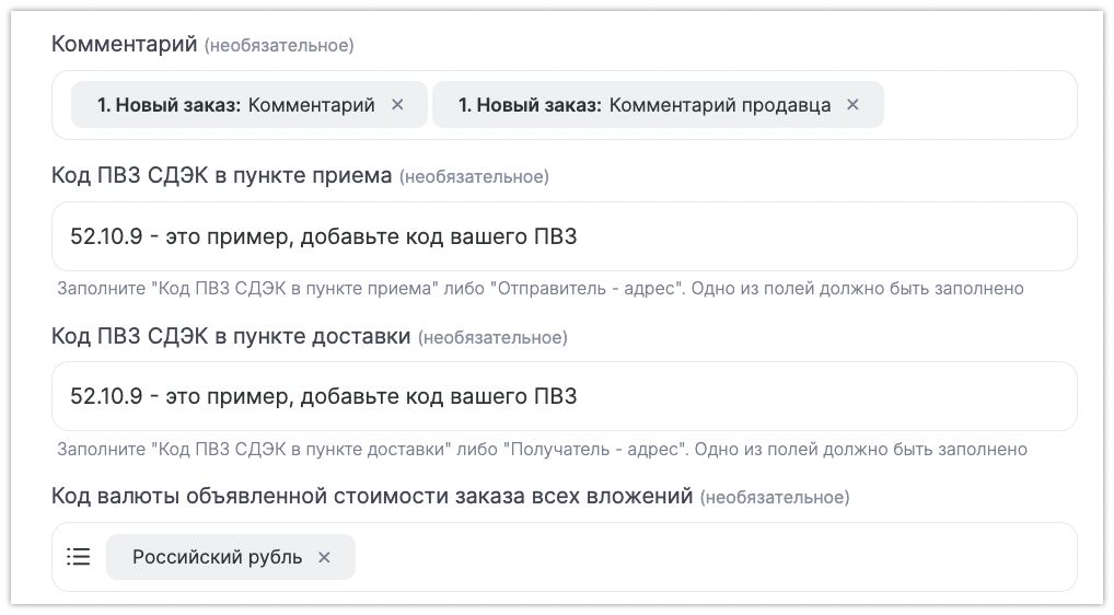 Код ПВЗ СДЭК в пункте приема и Код ПВЗ СДЭК в пункте доставки — берем из личного кабинета СДЭК и вписываем статично, так как у нас тип доставки «Склад-Склад». Вместо кода ПВЗ можно использовать поля с адресом отправления и адресом доставки. Адрес отправления можно вписать статично. Это тот адрес, который находится в твоем профиле СДЭКа, в качестве отправителя.