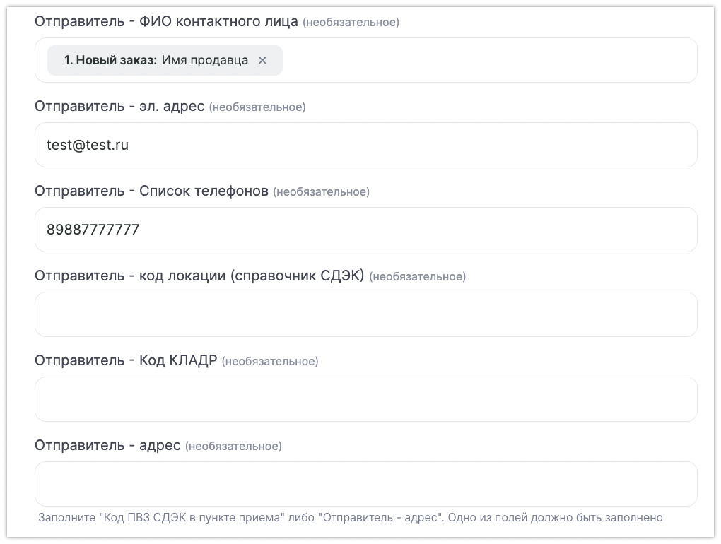 ФИО отправителя — можно вписать статично, как указано в СДЭК, а можно выбрать параметр «Имя продавца» из выпадающего списка ВКонтакте.