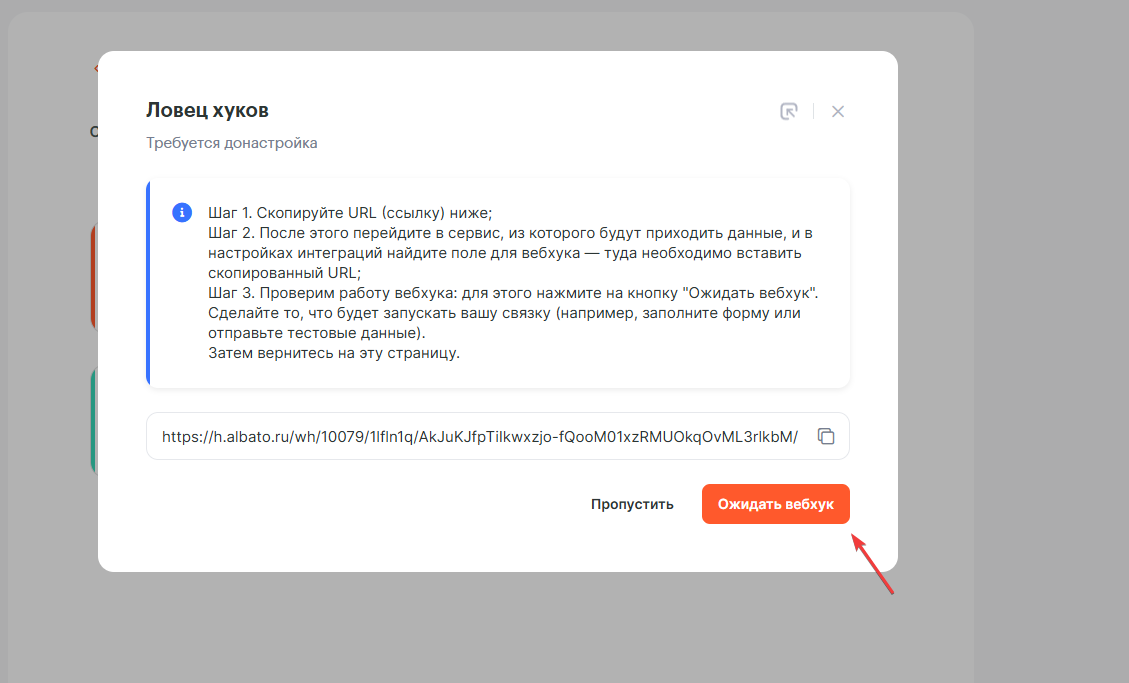 Теперь нужно «поймать» поля формы из Matomba. Для этого нажми Ожидать вебхук.