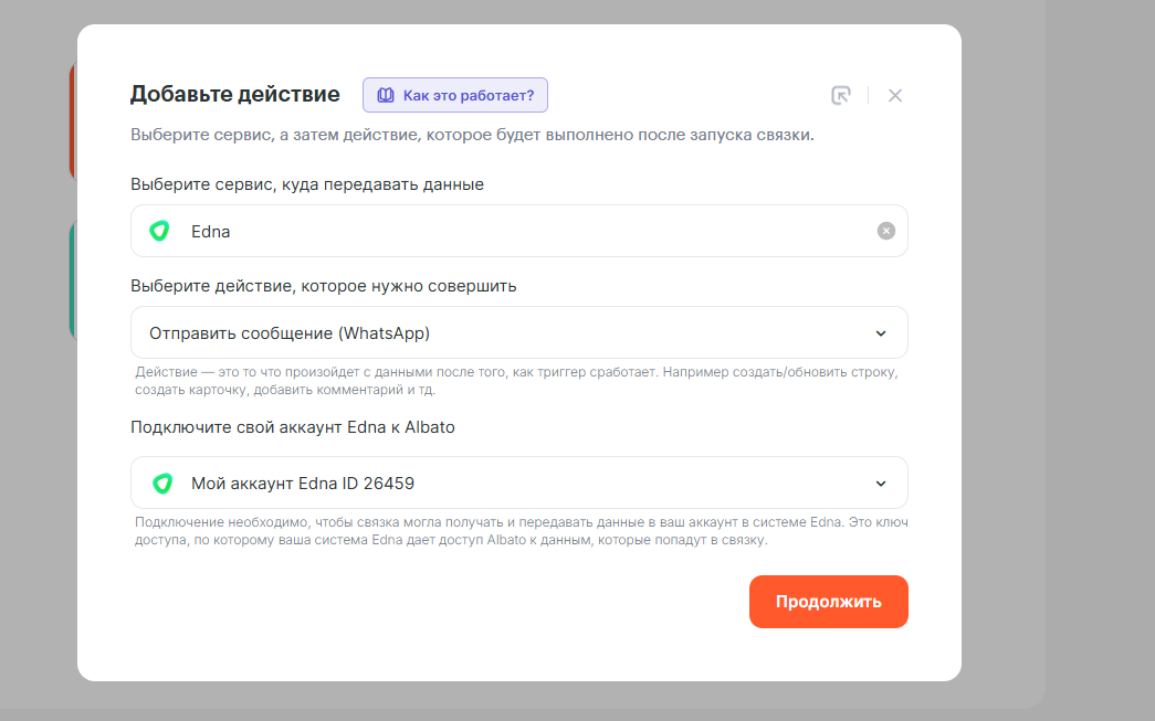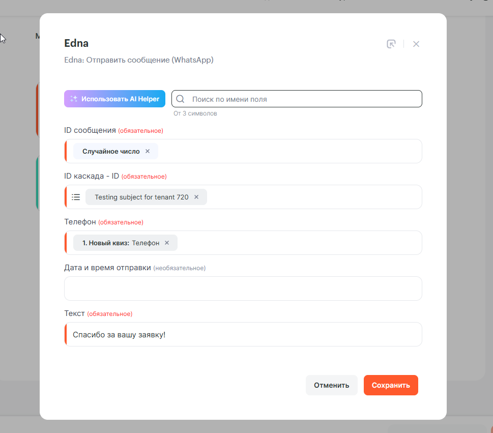 • Действие — Edna: Отправить сообщение (WhatsApp).