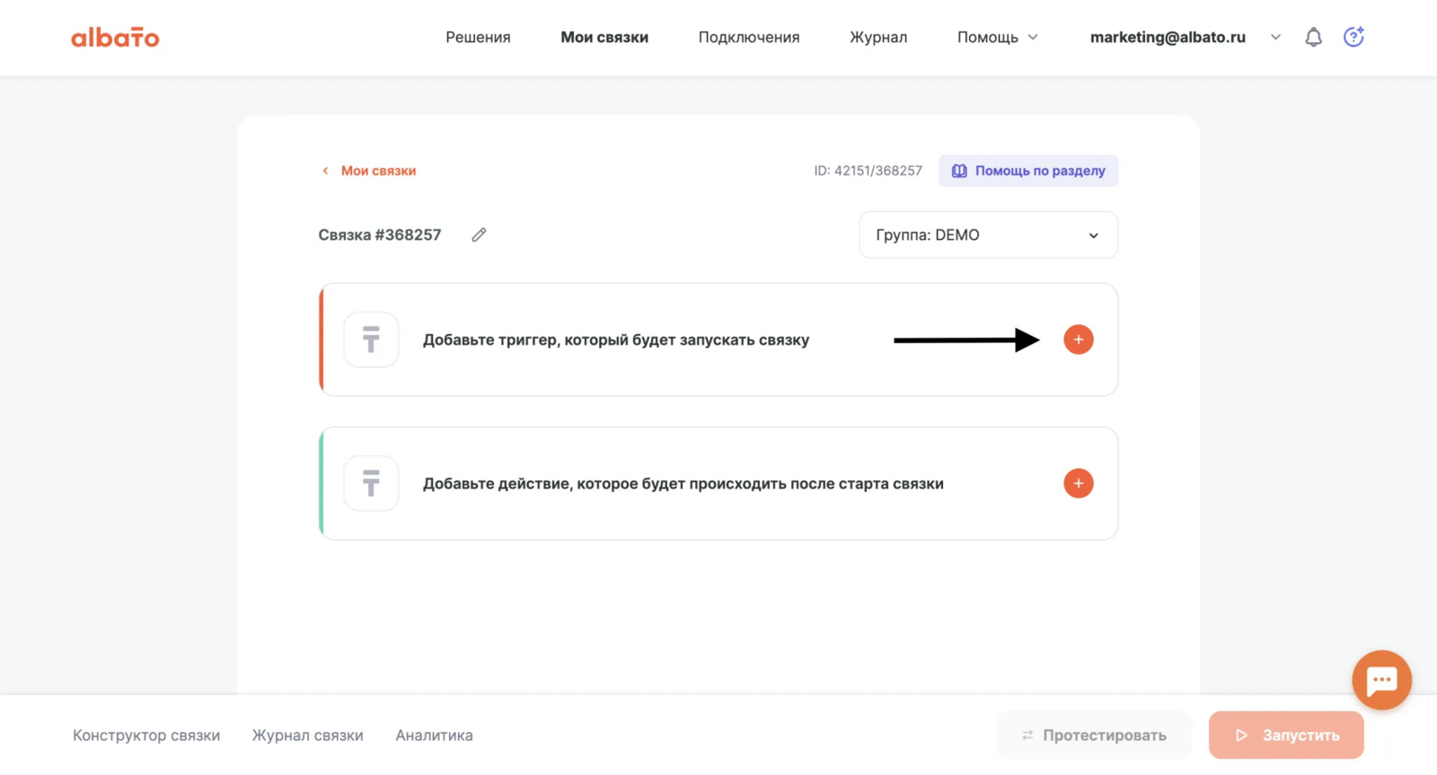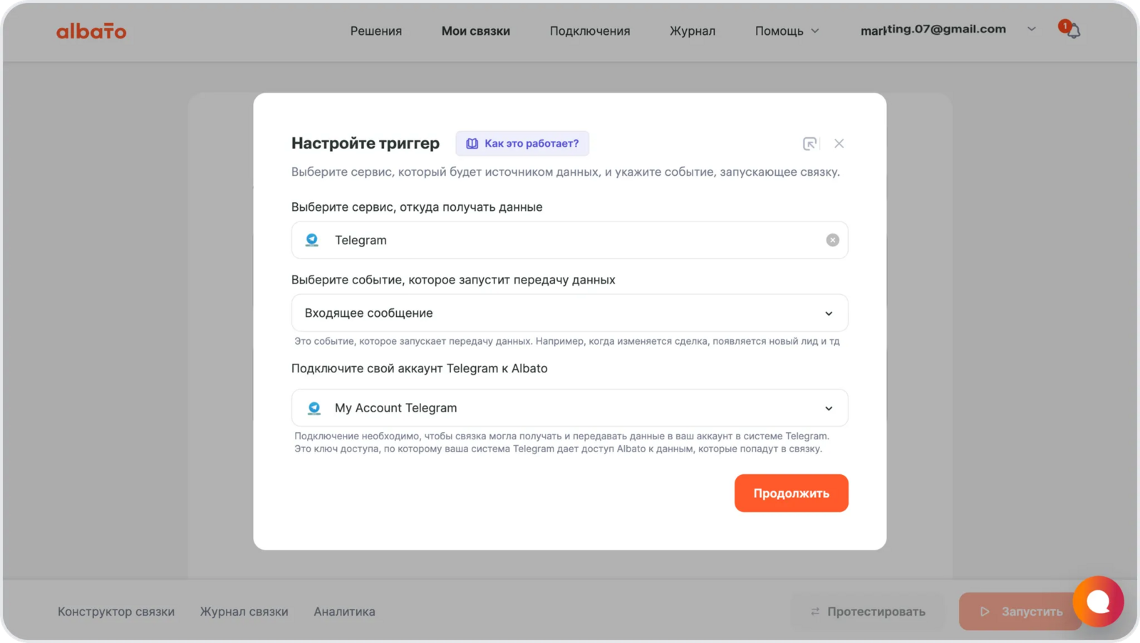 Перед настройкой связки необходимо подключить все сервисы к Альбато