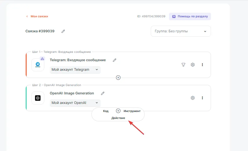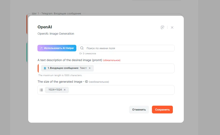 Теперь заполните поля в настройке действия, в поле promt передаем описание желаемого изображения, а так же выбираем нужный размер изображения.