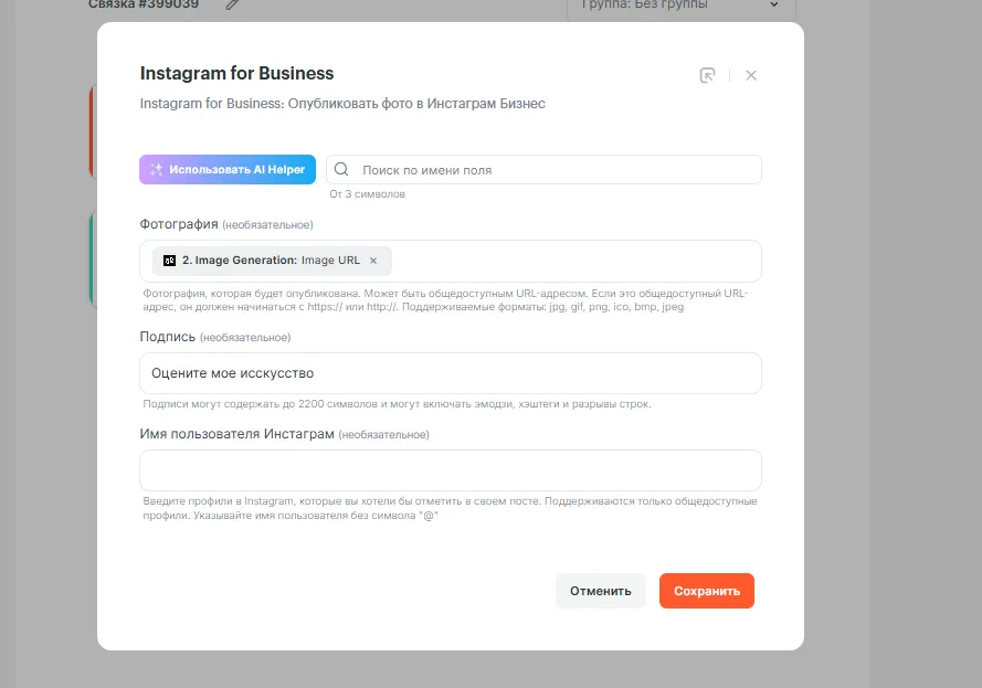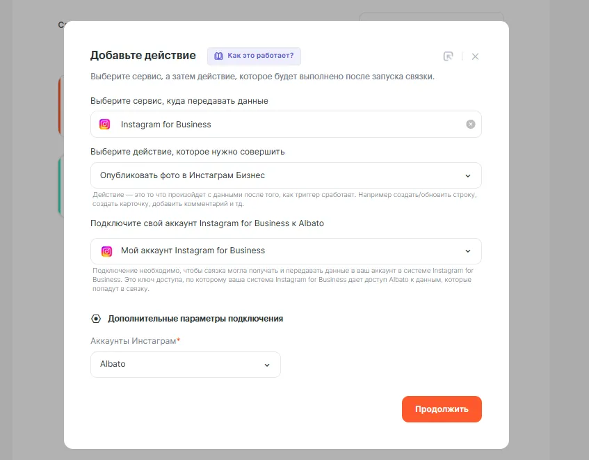 • Какое действие выполнить —  Опубликовать фото в Инстаграм Бизнес.