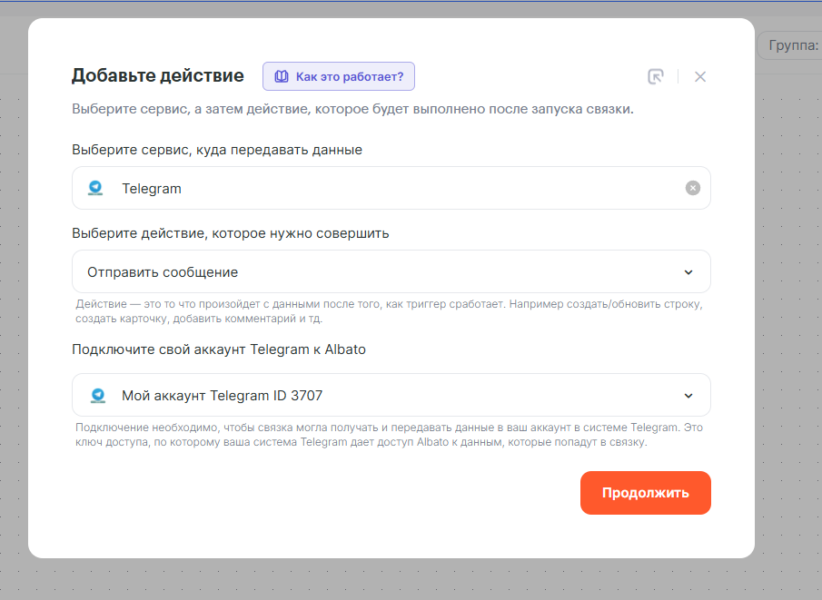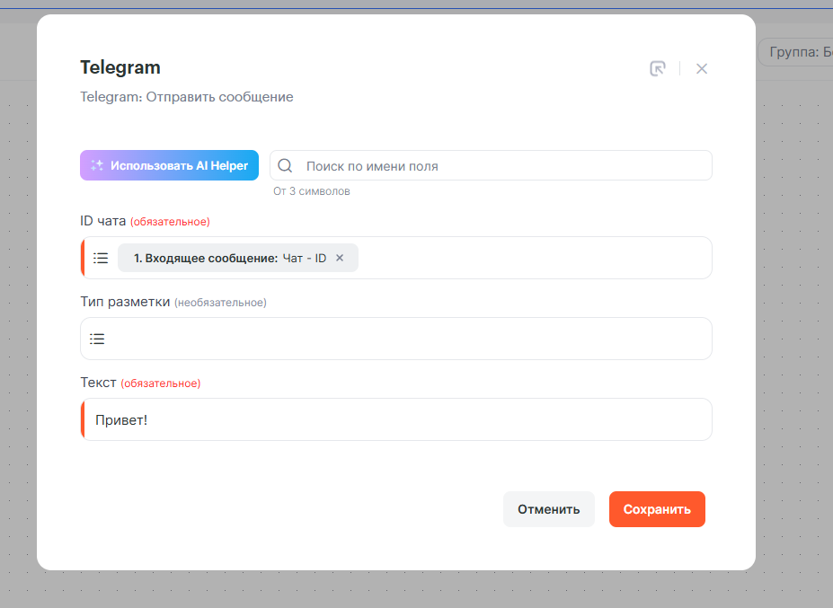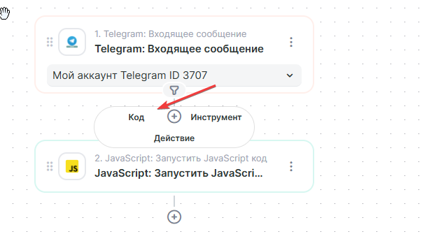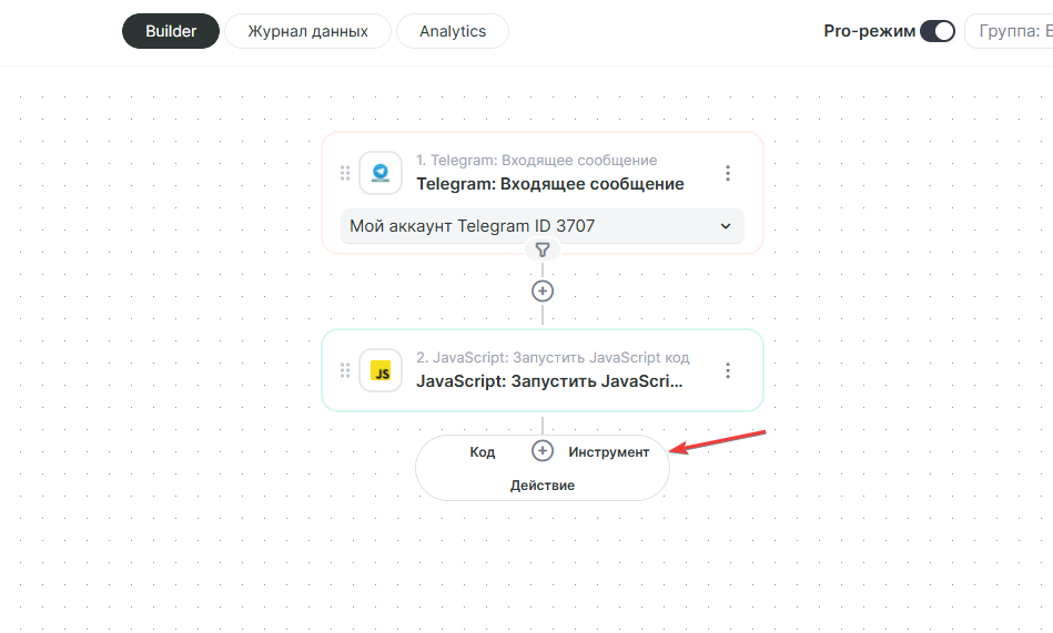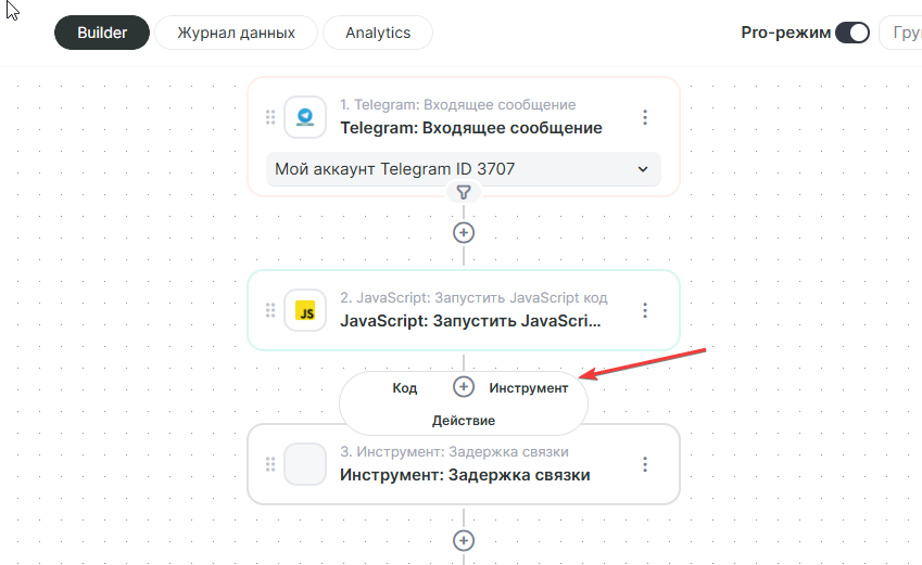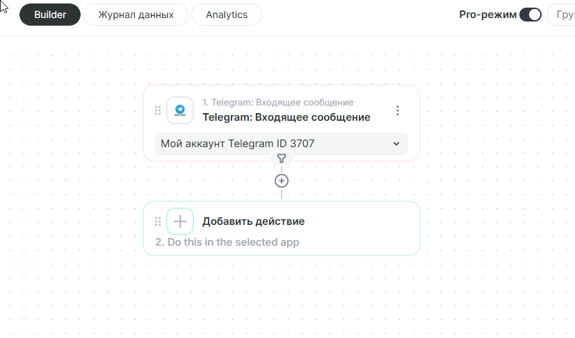 Теперь добавим в связку нужные нам шаги, для примера отправим сообщение обратно в Телеграм.