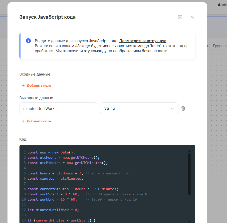 В “Выходные данные” добавляем переменную minutesUntilWork, и вставляем следующий код, в коде указываем нужные часы работы в переменных workStart и workEnd
