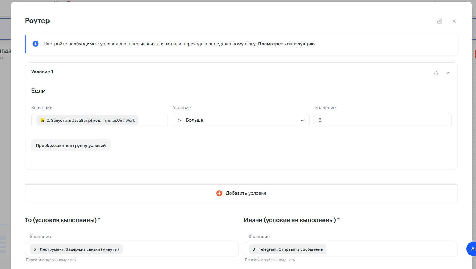 В Роутере указываем условие: Если количество минут до работы из инструмента JS больше 0 то переходим к задержке связки, иначе сразу отправляем сообщение.