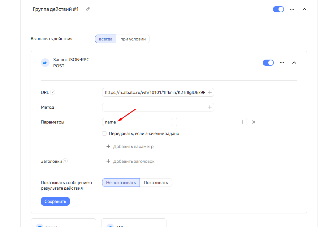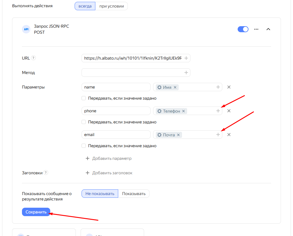 Теперь при заполнении формы, данные будут «запаковываться» в определенный формат и передаваться на адрес Albato. При этом информация из каждого поля будет складываться в свою переменную. Эти переменные нужно создать вручную. Для этого в блоке «Параметры», в первой колонке укажи имена, под которыми дальше получишь данные из полей: