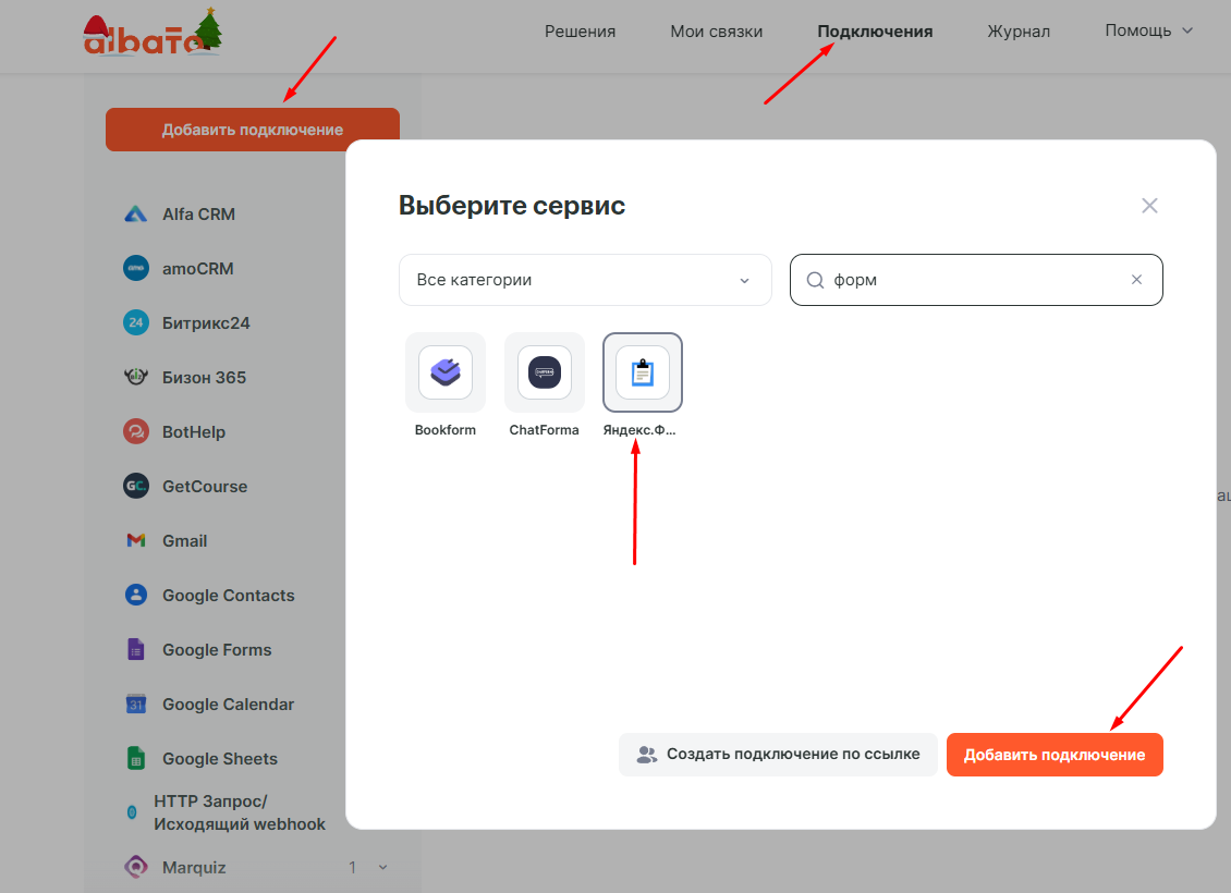 Зайди в раздел «Подключения», нажми «Добавить подключение», в окне поиска напиши “Яндекс.Формы“ и нажми «Добавить подключение».