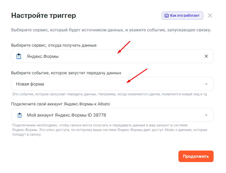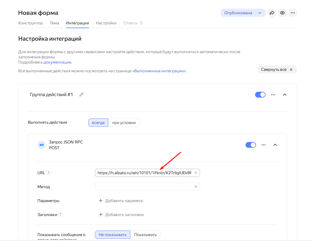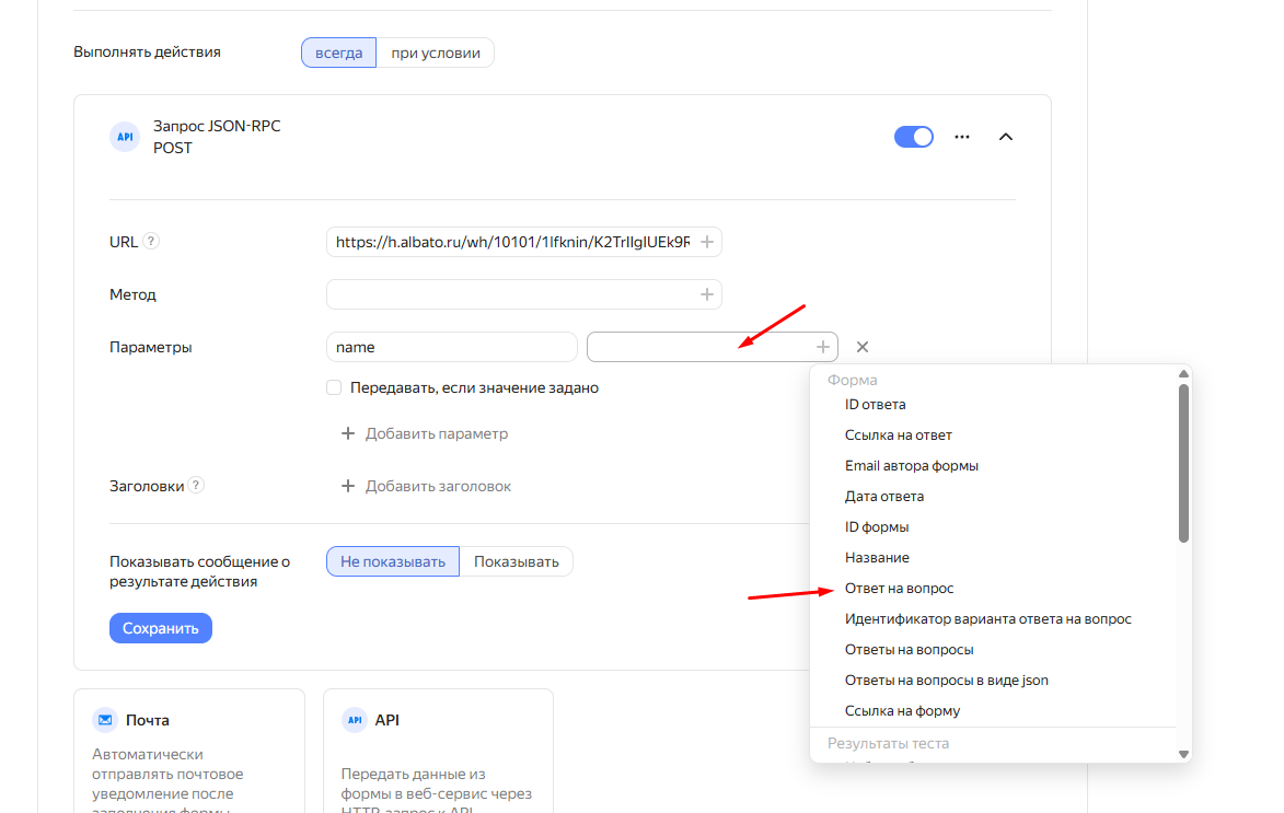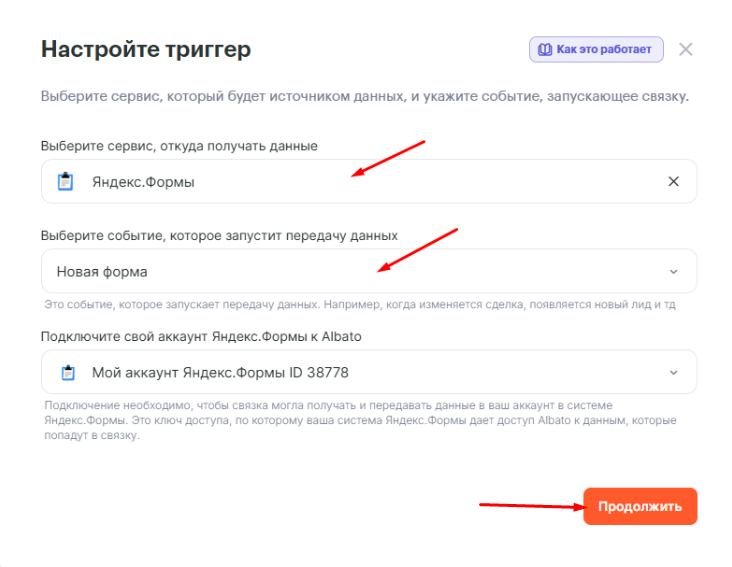 Чтобы создать интеграцию Яндекс.Форм с другими платформами через Albato, потребуется на стороне ЛК Форм указать специальный адрес, куда будут отправляться данные (webhook) и настроить несколько параметров.
