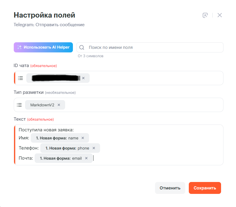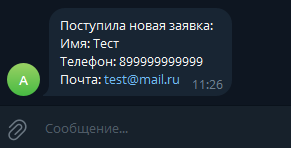 Ниже приведен пример связки, которая отправляет сообщение в чат Telegram при поступлении информации о заполнении формы. Такая связка поможет менеджерам быстро получать сообщения о новой заявке.