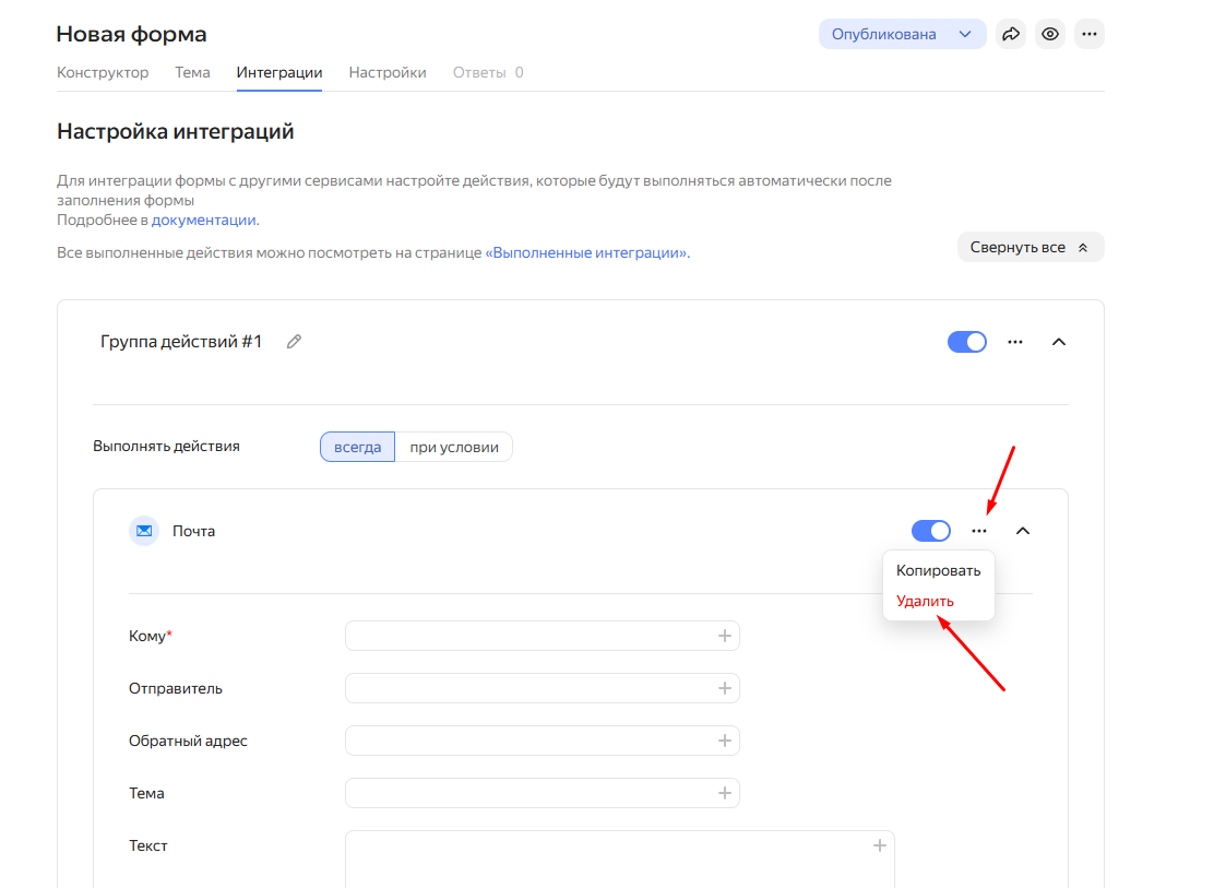 В этом разделе будет уже созданное действие “Почта“ — его можно удалить.
