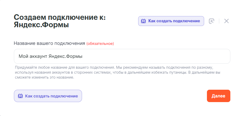 В открывшейся форме требуется заполнить только поле «Название». Можешь оставить стандартное имя, а можешь указать указать уникальное, чтобы в дальнейшем было проще идентифицировать подключение в общем списке. Нажми “Далее“