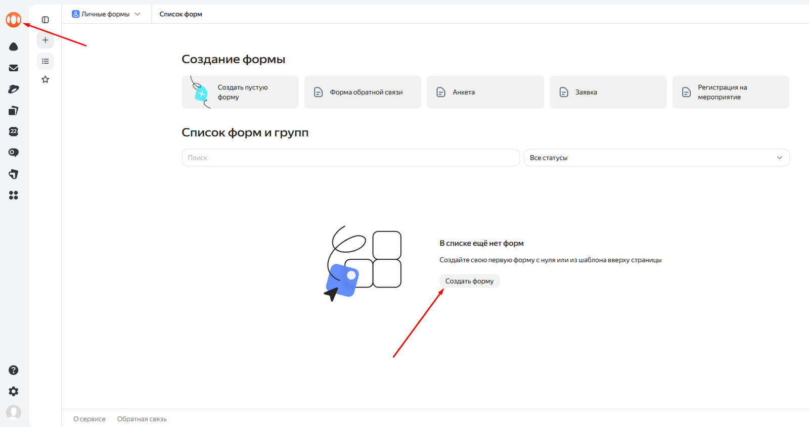 Открой ЛК Яндекс.Форм. Перейди во вкладку «Мои формы» и создай новую или выбери нужную, если уже создана: