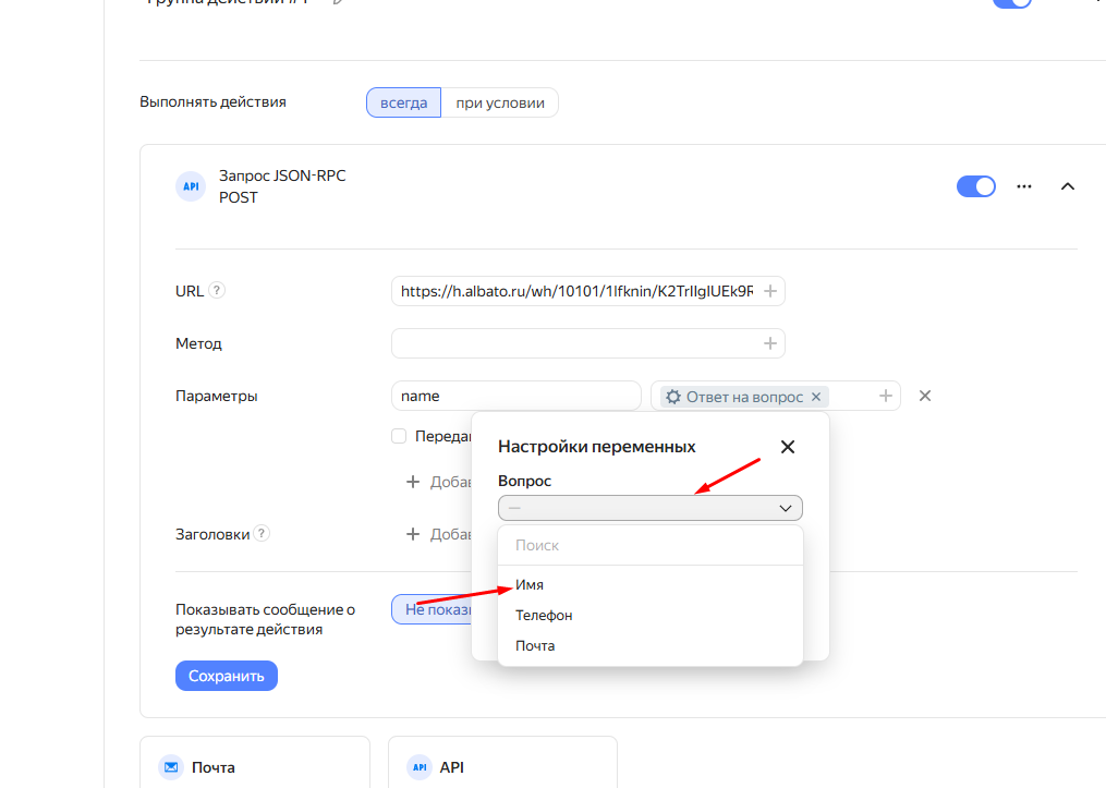 Аналогично создай переменные для оставшихся вопросов, если они есть и нажми “Сохранить“: