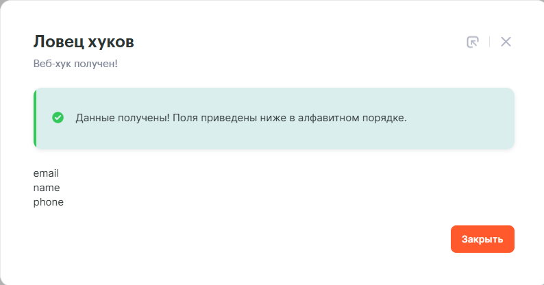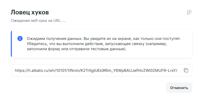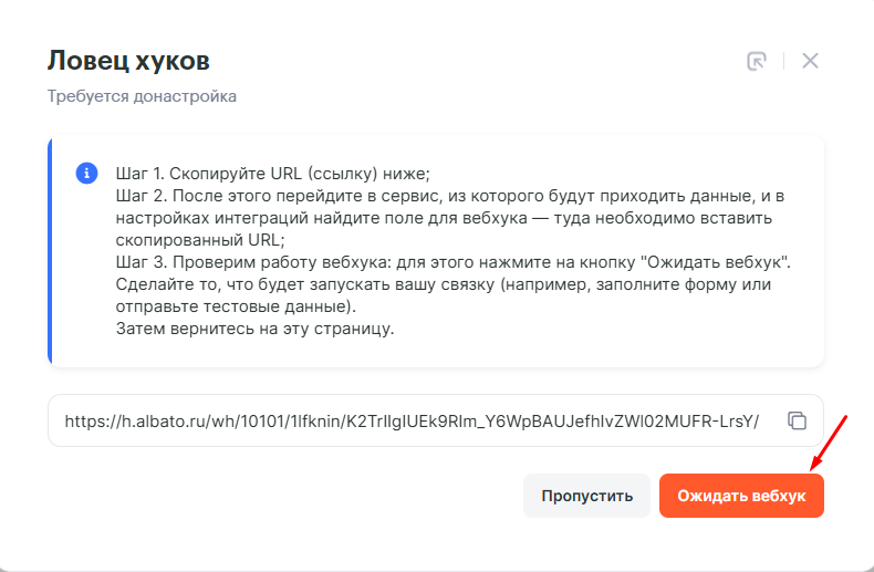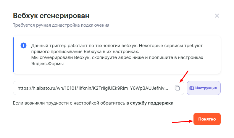 В окне с оповещением об успешной генерации вебхука скопируй полученную ссылку:
