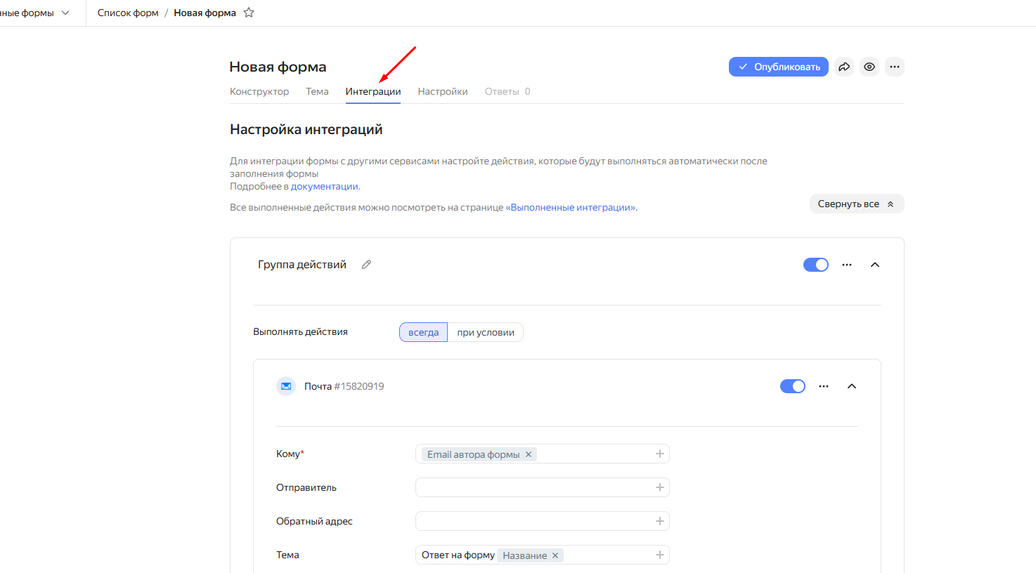 В открывшихся настройках формы открой вкладку «Интеграция».