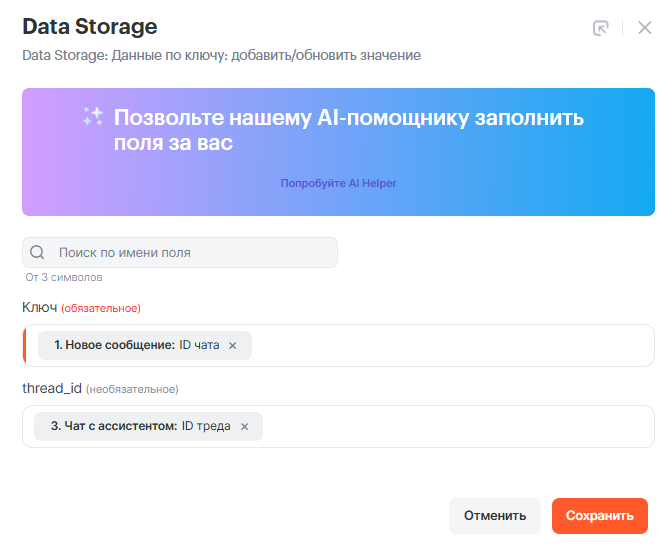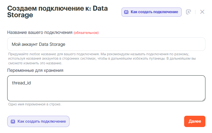 • ID треда: thread_id **из Шага 2: **Data Storage
