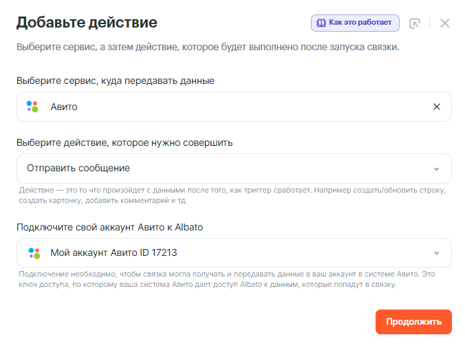 • Сервис, куда передавать данные: Авито
