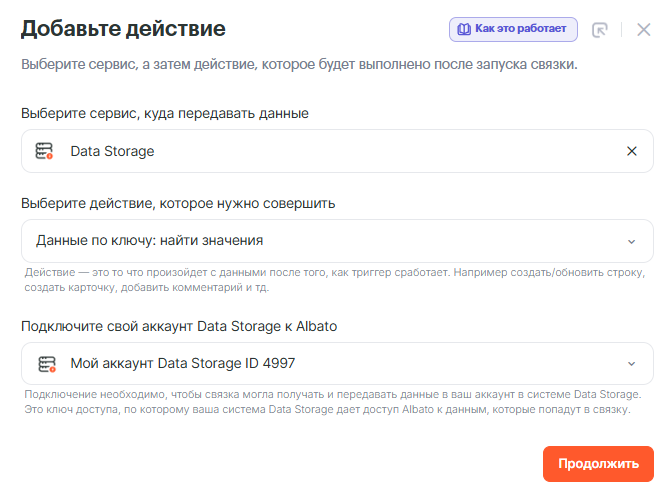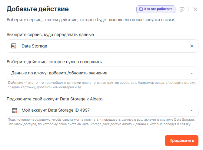 • Действие, которое нужно совершить: Данные по ключу: добавить/обновить значение