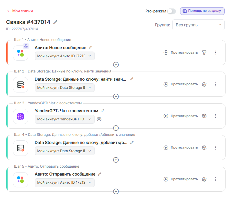Готово! Теперь все новые сообщения из Авито будут автоматически обрабатываться YandexGPT, а контекст диалога сохраняется через Data Storage.