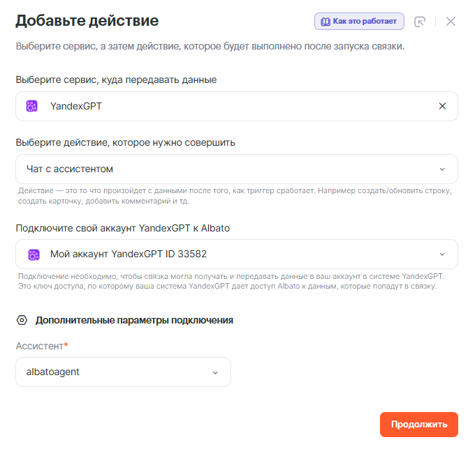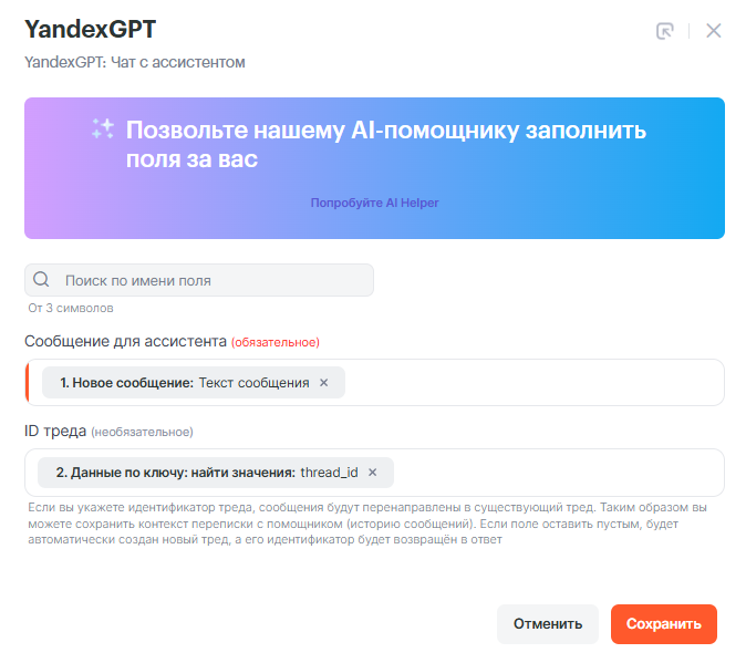 • Ассистент — выберите ассистента, созданного Вами ранее в YandexGPT
