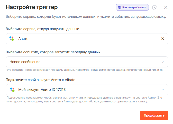 Шаг 1: Триггер — Авито: Новое сообщение