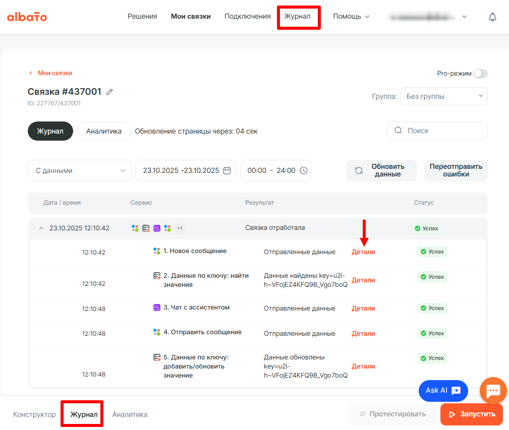Результат работы связки можно посмотреть во вкладке Журнал.