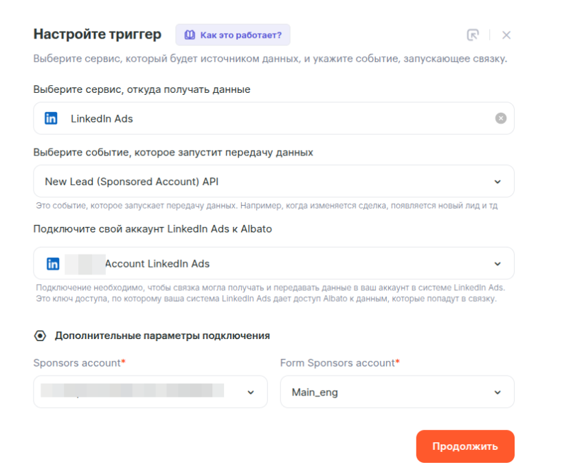 - Сервис, из которого будете получать данные — LinkedIn Ads
