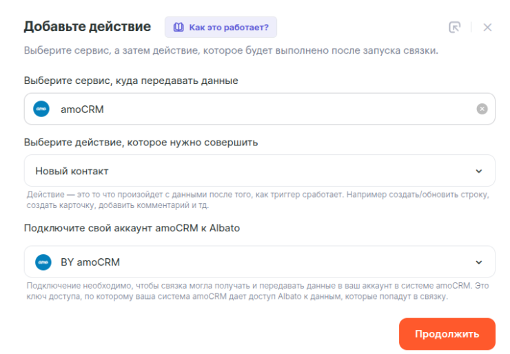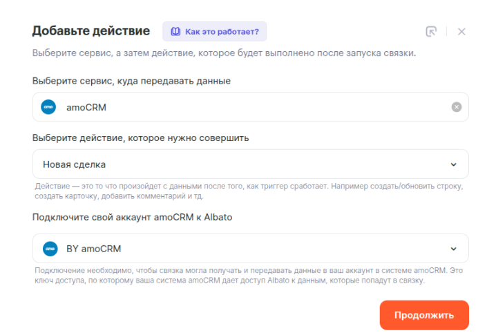 - Сервис, в который будете передавать данные — AmoCRM