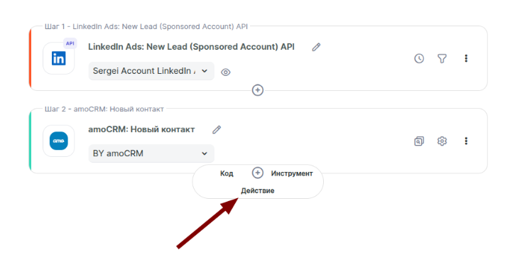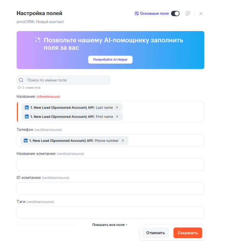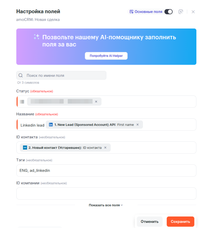 Связка готова! Теперь её можно запустить. При получении новых данных в форме LinkedIn Ads в Вашем AmoCRM автоматически будет создан новый контакт и сделка.