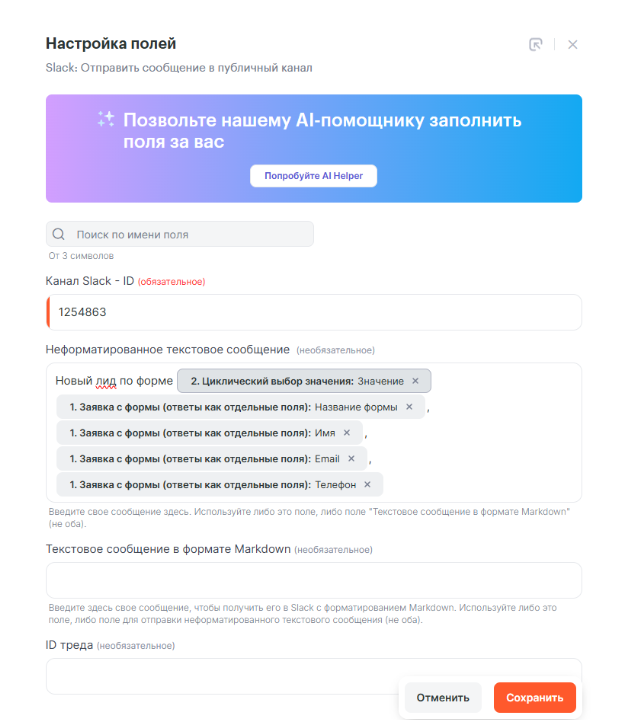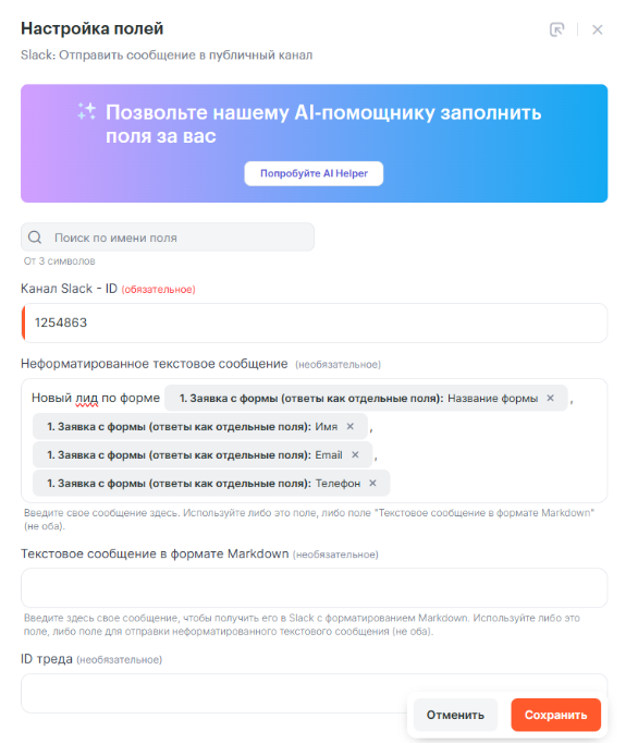 В поле Канал Slack — ID из выпадающего списка выберите канал, в который будет отправлено сообщение. В поле Неформатированное текстовое сообщение впишите текст, который будет передан в выбранный канал. Также  в этом поле вы можете подставить ответы на лид форму.