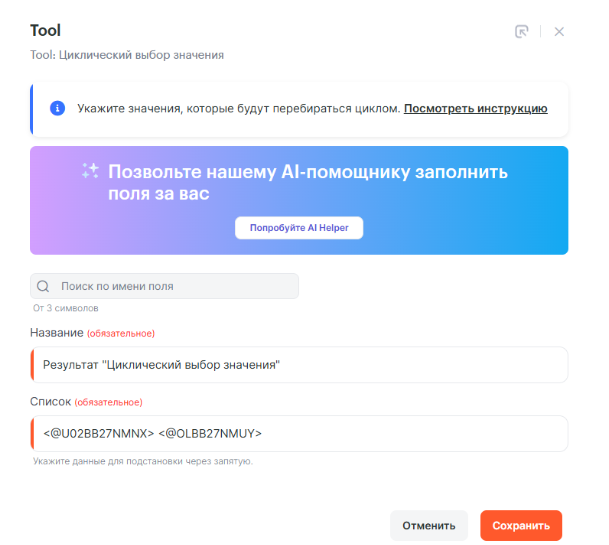 В открывшемся окне заполните поле Список ID пользователей из Slack вида <@ID пользователя>