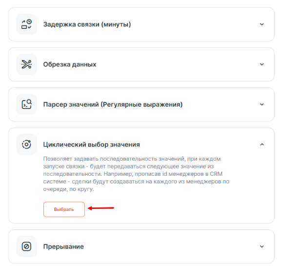 Чтобы распределять заявки на разных менеджеров и оповещать в канале ответственного, воспользуйтесь инструментом «Циклический выбор значения». Для этого нажми + на действии Заявка с формы (ответы как отдельные поля) и выберите инструмент Циклический выбор значения.