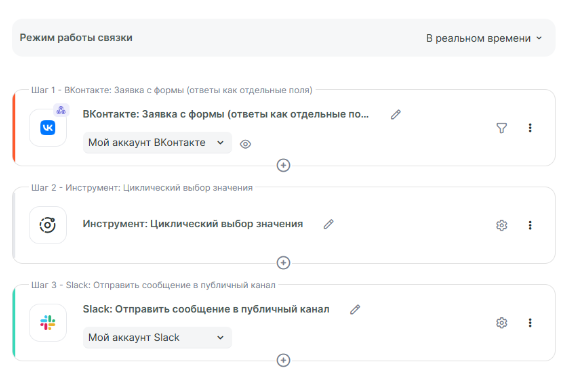 Чтобы быстро обрабатывать заявки из ВКонтакте не нужно постоянно заходить в рекламный кабинет. С помощью автоматизации, можно в режиме реального времени получать данные о новых заявках в мессенджеры, например в Slack, и распределять их между менеджерами.