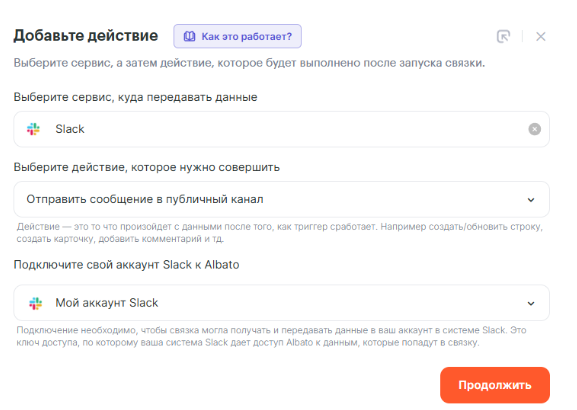 Действия — что делает Albato после запуска связки. Также действия позволяют передавать данные в другие сервисы и системы.