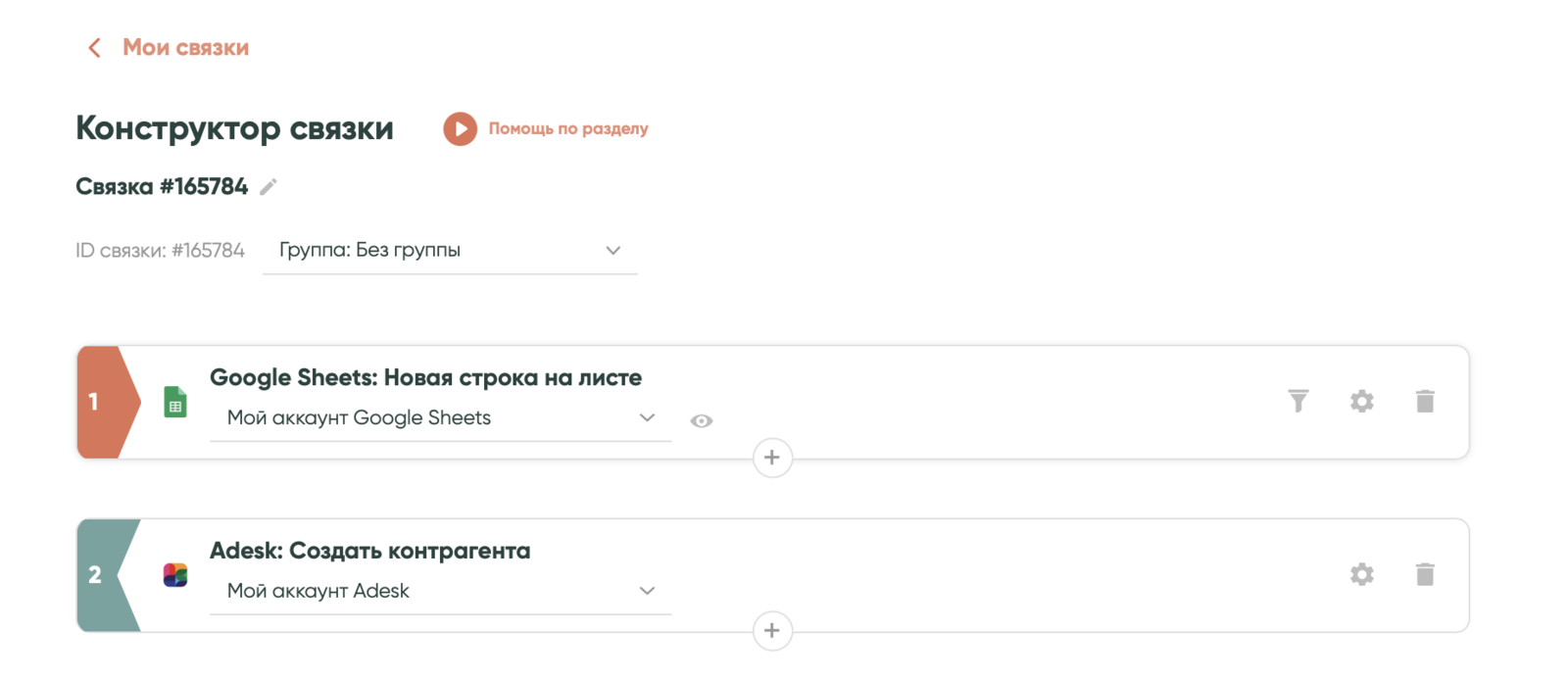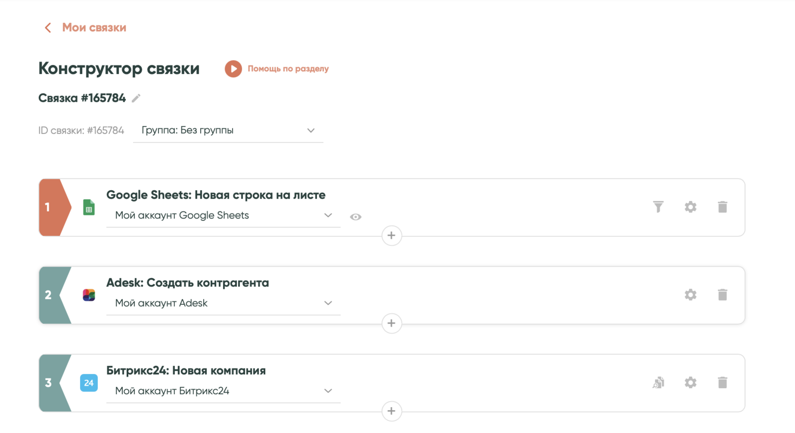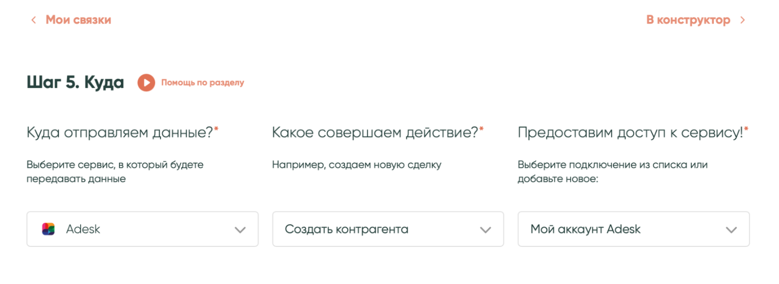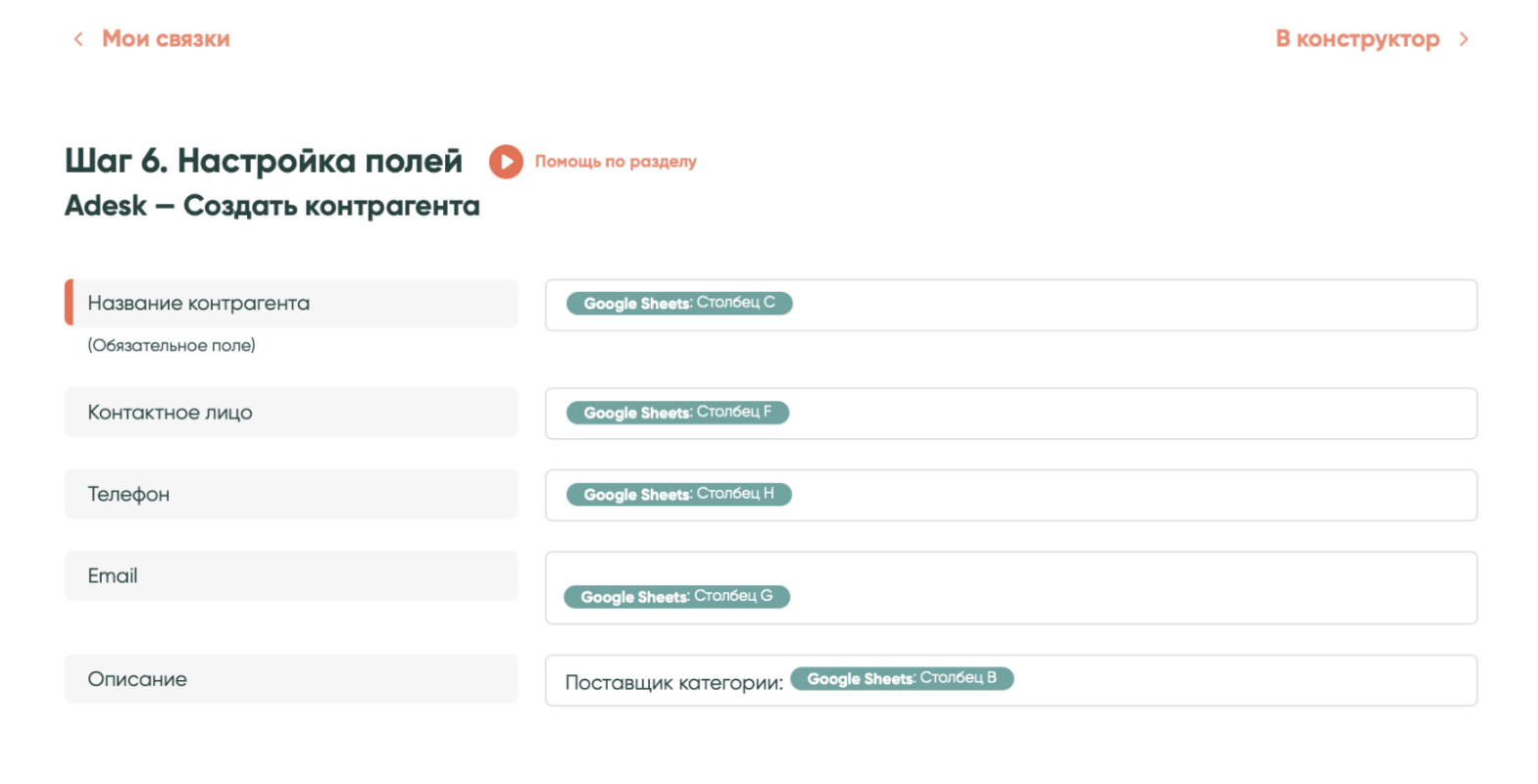 Повтори настройки из предыдущего шага и выбери, какие данные из полей Google Sheets будут передаваться в «Битрикс24». Нажми «Сохранить». Связка готова. Теперь при заведении нового контрагента в таблице, данные автоматически попадут в Adesk и «Битрикс24».