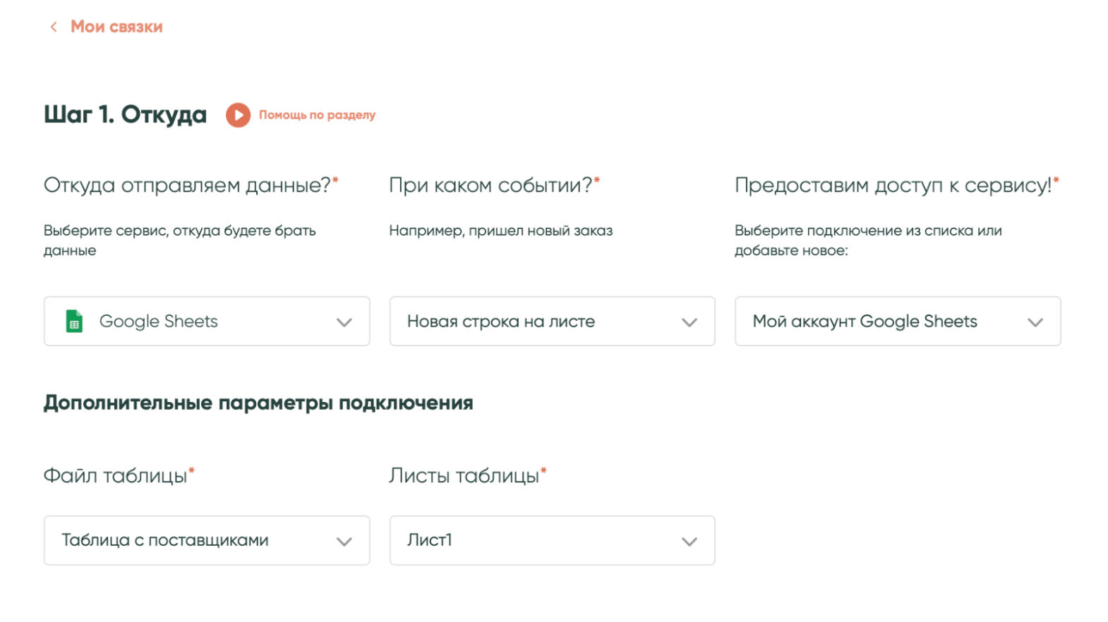 - Выбери сервис, откуда будешь передавать данные — Google Sheets.