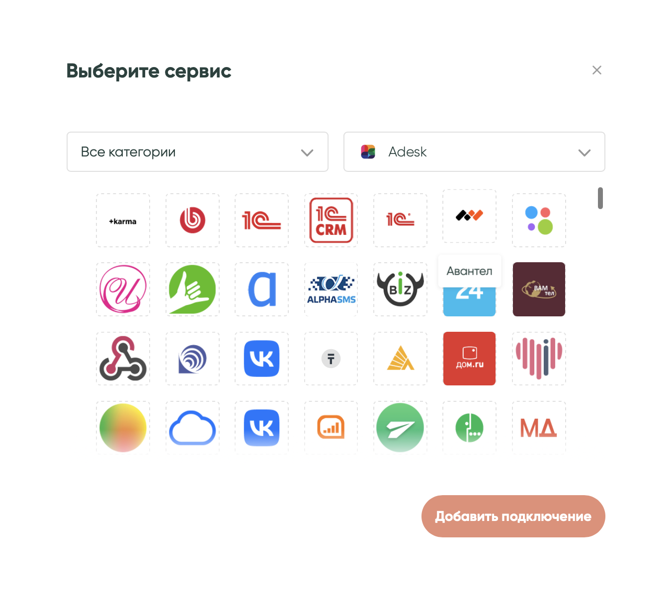 Зайди в раздел «Подключения», нажми на кнопку «Добавить подключение» и выбери из списка «Adesk».