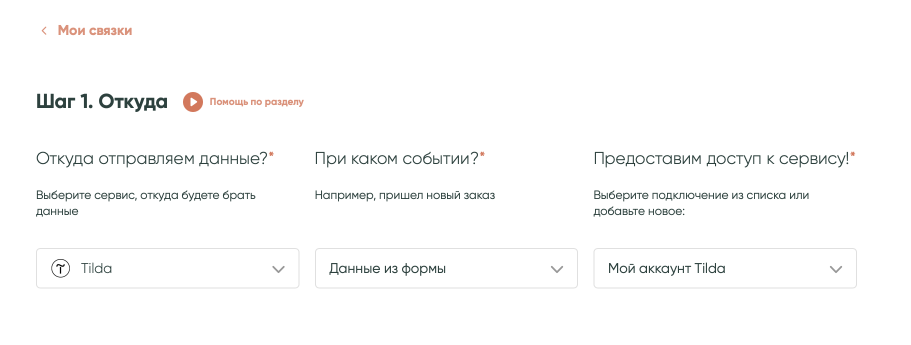 - Выбери сервис, который будет запускать сценарий — «Tilda».